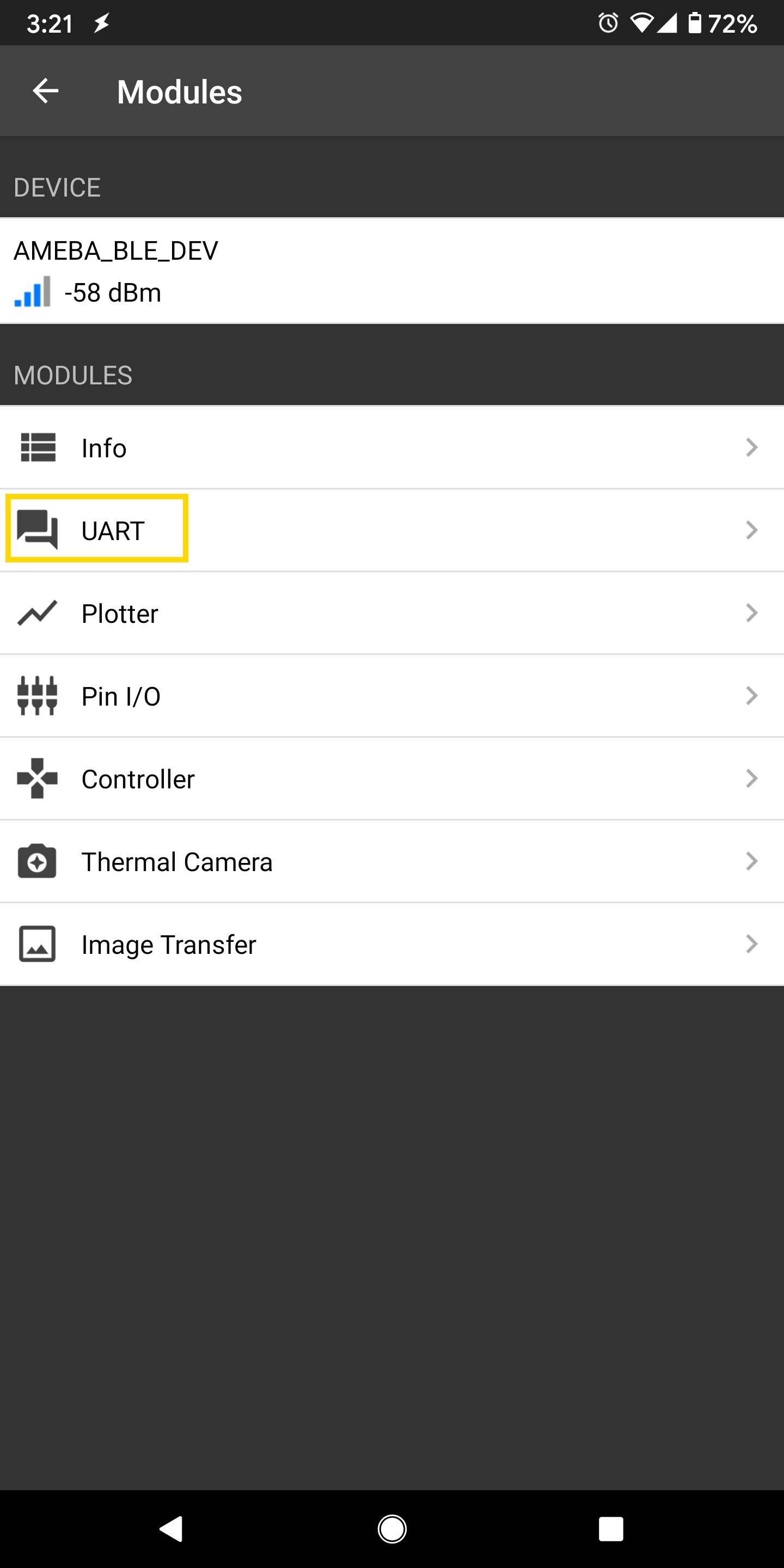 Open the app on your mobile phone, scan and connect to the Ameba board shown as AMEBA_BLE_DEV and choose the UART function in the app. Note that the BLE UART service on the Ameba board will only work with the UART and Plotter functions in the Bluefruit Connect app, other functions (Pin I/O, Image Transfer) require other BLE services that are not included in this example.