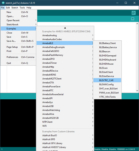 Open the example, Files -> Examples -> AmebaBLE -> BLEV7RC_CAR
