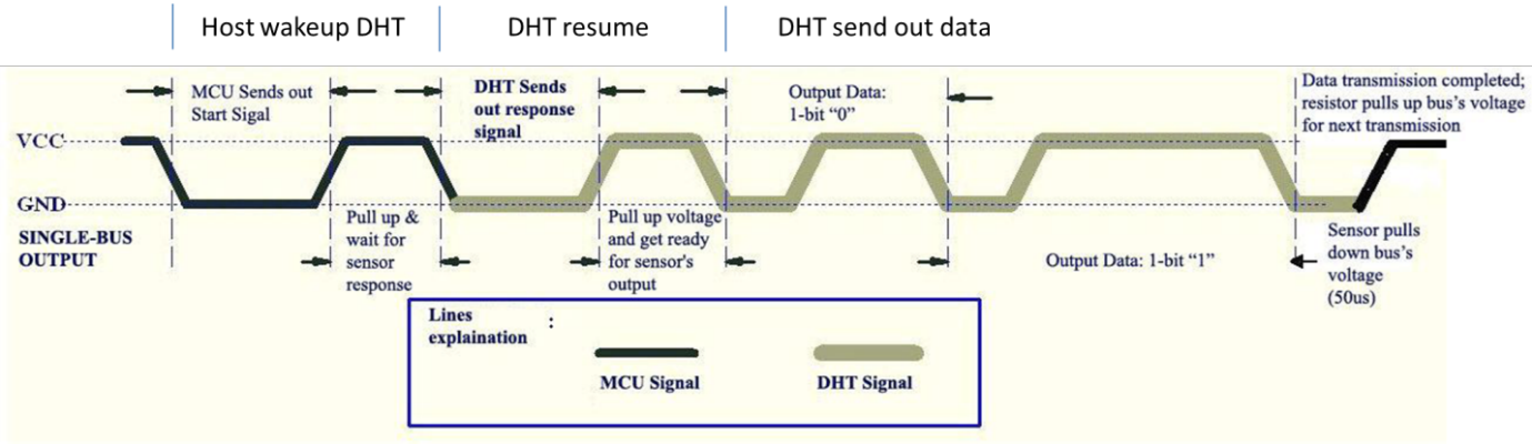 DHT sends data: DHT sends out the temperature/humidity data (which has size 5 bytes) in a bit by bit manner. To represent each bit, DHT first pull low the DATA GPIO pin for a while and then pull high. If the duration of high is smaller than low, it stands for bit 0. Otherwise it stands for bit 1.
