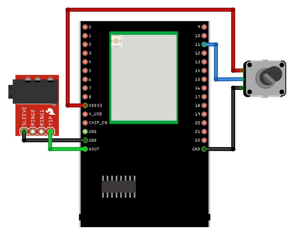 Connect the audio jack and potentiometers to the Ameba board as shown in the diagram.