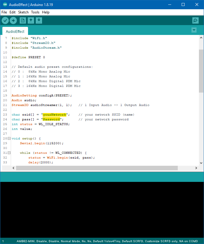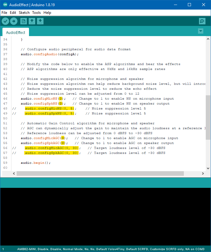 In this example, turning the potentiometers will adjust the microphone sensitivity. Increasing the sensitivity will allow the microphone to pick up softer sounds but will also increase the background noise. Modify the highlighted lines of code to enable or disable the NS and AGC audio effect algorithms on the microphone audio input or the speaker audio output. Recompile and reupload the code to hear the effects.
