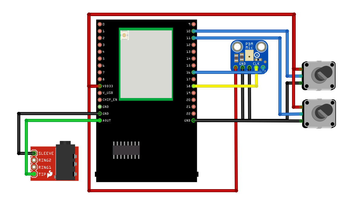 Alternatively, connect the audio jack, potentiometers, and PDM Microphone as shown in the diagram below if you would like to use a digital microphone.