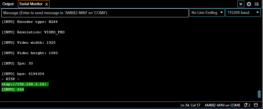 Compile the code and upload it to Ameba. After pressing the Reset button, wait for the Ameba Pro 2 board to connect to the WiFi network. The board's IP address and network port number for RTSP will be shown in the Serial Monitor.