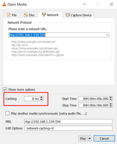 You may choose to change the caching time in Show more options. A lower cache time will result in reduced video latency but may introduce playback stuttering in the case of poor network conditions.