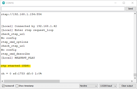 Next, click Play to start RTSP streaming. The video stream from the camera will be shown in VLC media player. Meanwhile, in your Serial Monitor, the message rtp started (UDP) will appear.