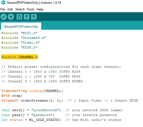 The camera can produce 3 simultaneous video stream channels, with the default configuration for each channel as shown. You may choose to edit the code to use a different video stream.