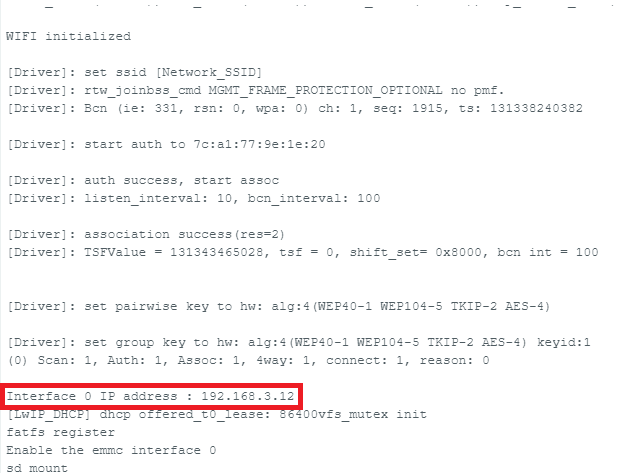 Compile the code and upload it to Ameba. After pressing the Reset button, wait for the Ameba Pro 2 board to connect to the WiFi network. The board's IP address will be shown in the Serial Monitor.