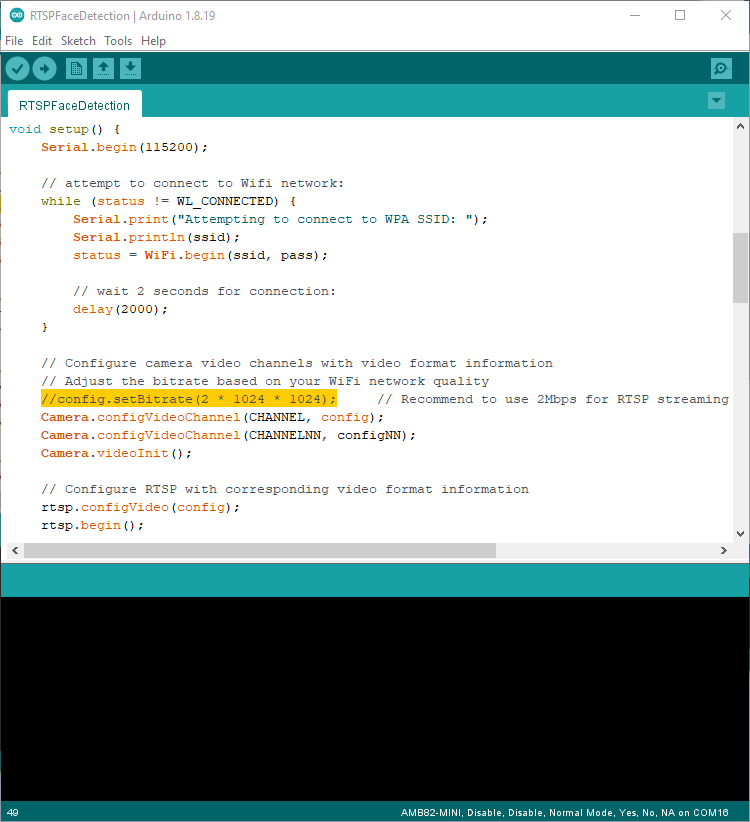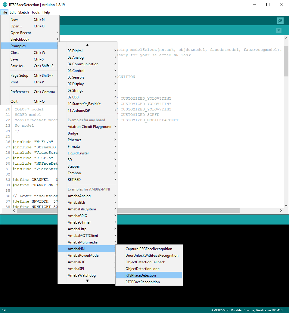 Open face detection example in File -> Examples -> AmebaNN -> RTSPFaceDetection