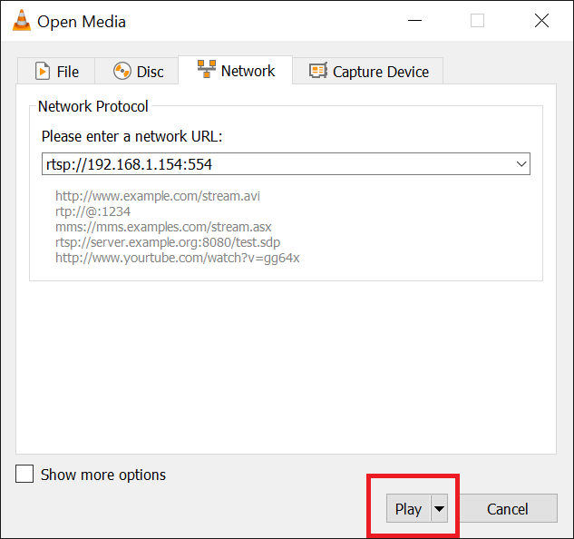 Next, click Play to start RTSP streaming to see the result. The video stream from the camera will be shown in VLC media player.