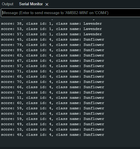 Now, you will be able to see what the camera is capturing. The detected class and its probability will be displayed in the Serial Monitor and at the top-left corner of the video stream.