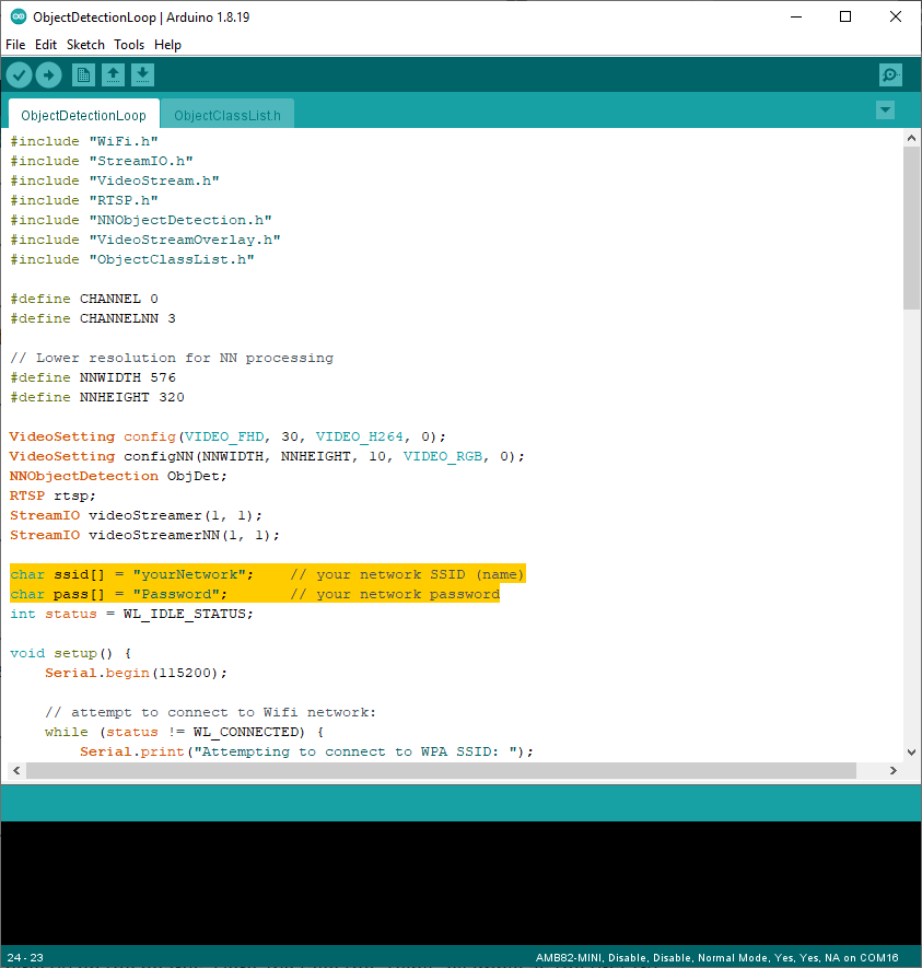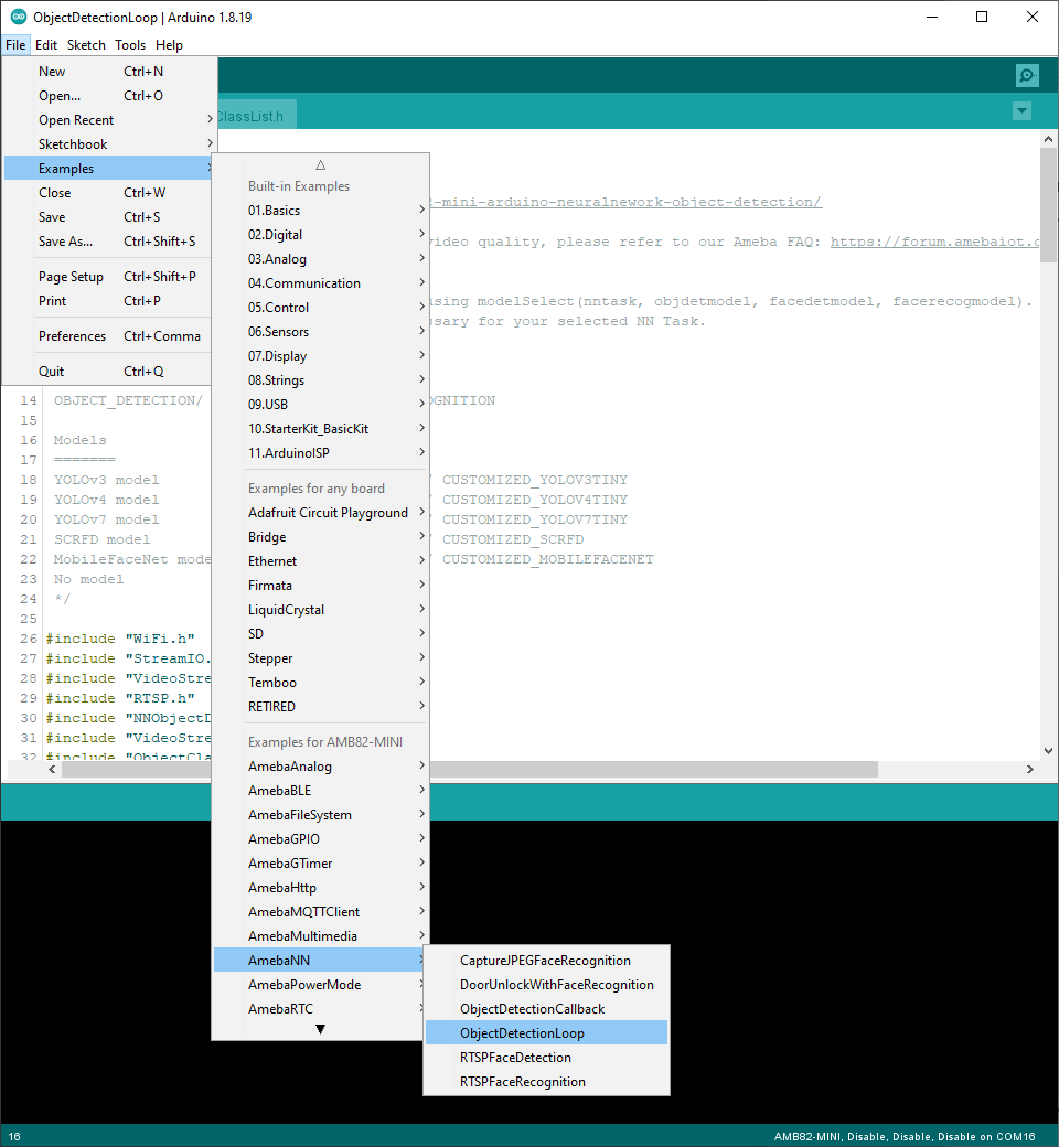 Open one of the Object Detection examples in File -> Examples -> AmebaNN -> ObjectDetectionLoop