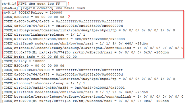 Linux 的 Coex 日志默认是关闭的。使用 Trace Tool 中的 AT 命令 “ATWZ dbg coex log FF” 可以动态开启并捕获日志。 使用 AT 命令 “ATWZ dbg coex log 0” 可以关闭 Coex 日志。