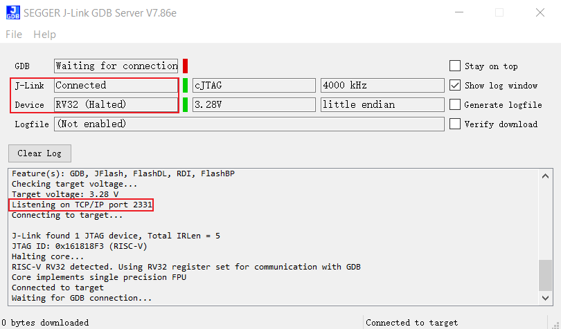 /amebalite_gcc_project/utils/jlink_script/kr4_jlinkGDBSever.sh,如下所示,确认 KR4 与 JLinkGDBSever 成功连接。------Target related settings------ Target device: RV32 Target interface: cJTAG Target interface speed: 4000kHz Target endian: little Connecting to J-Link... J-Link is connected. Firmware: J-Link V11 compiled Apr 27 2041 16:36:21 Hardware: V11.00 S/N: 50120677 Feature(s): GDB, JFlash, FlashDL, RDI, FlashBP Checking target voltage... Target voltage: 3.32 V Listening on TCP/IP port 2331 Connecting to target... J-Link found 1 JTAG device, Total IRLen = 5 JTAG ID: 0x161818F3 (RISC-V) Connected to target Waiting for GDB connection...