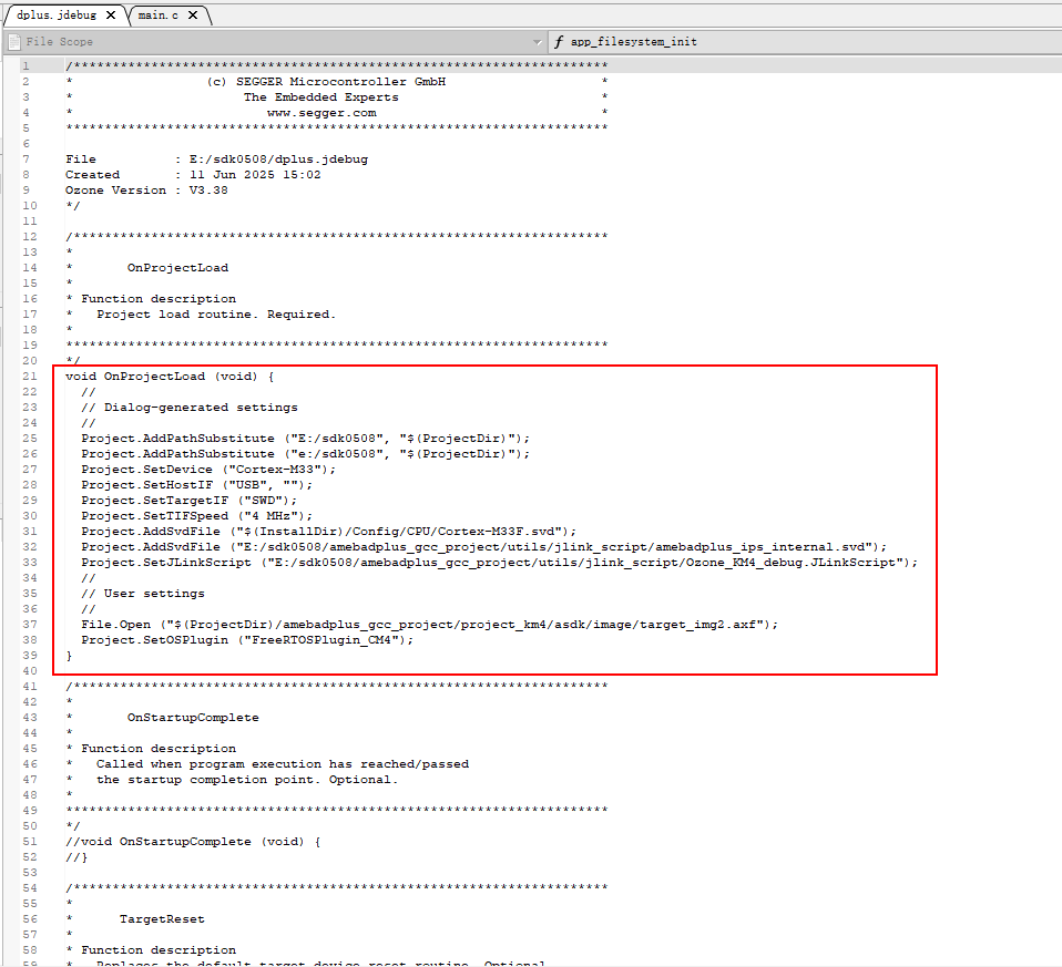 /amebasmart_gcc_project/utils/jlink_script/cm4_jlink.sh,如下所示,确认 KM4 与 JLinkGDBSever 成功连接。------J-Link related settings------ J-Link Host interface: USB J-Link script: AP1_KM4.JLinkScript J-Link settings file: none ------Target related settings------ Target device: cortex-m33 Target interface: SWD Target interface speed: 4000kHz Target endian: little Connecting to J-Link... J-Link is connected. Firmware: J-Link V11 compiled Apr 27 2041 16:36:21 Hardware: V11.00 S/N: 50120677 Feature(s): GDB, JFlash, FlashDL, RDI, FlashBP Checking target voltage... Target voltage: 3.40 V Listening on TCP/IP port 2335 Connecting to target... Connected to target Waiting for GDB connection...