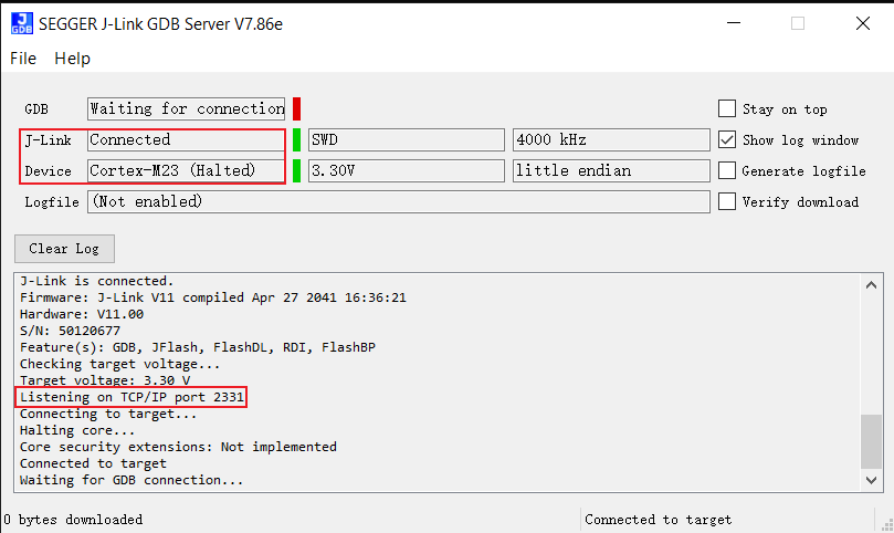 /amebasmart_gcc_project/utils/jlink_script/cm0_jlink.sh,如下所示,确认 KM0 与 JLinkGDBSever 成功连接。------J-Link related settings------ J-Link Host interface: USB J-Link script: AP0_KM0.JLinkScript J-Link settings file: none ------Target related settings------ Target device: cortex-m23 Target interface: SWD Target interface speed: 4000kHz Target endian: little Connecting to J-Link... J-Link is connected. Firmware: J-Link V11 compiled Apr 27 2041 16:36:21 Hardware: V11.00 S/N: 50120677 Feature(s): GDB, JFlash, FlashDL, RDI, FlashBP Checking target voltage... Target voltage: 3.40 V Listening on TCP/IP port 2331 Connecting to target... Connected to target Waiting for GDB connection...