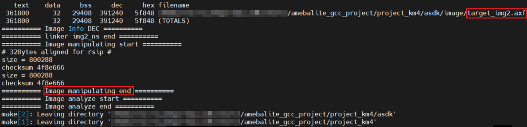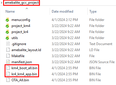 /amebalite_gcc_project路径下,用户也可以在如下文件夹看到固件:/amebalite_gcc_project/project_km0/asdk/image/amebalite_gcc_project/project_km4/asdk/image