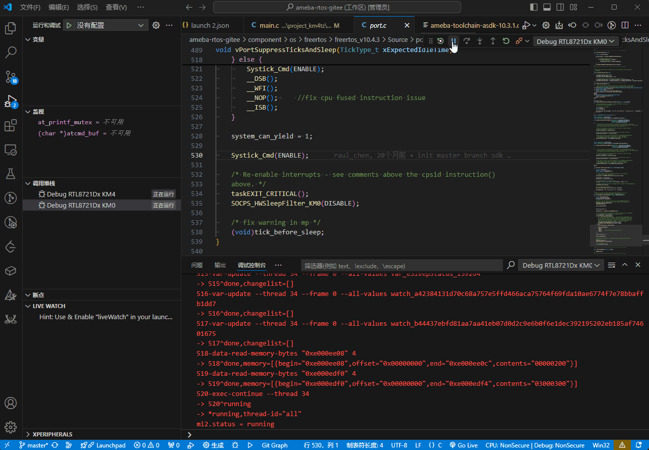 多核调试时需要单独控制。在调用堆栈视图中点击 RA 按钮进行切换。