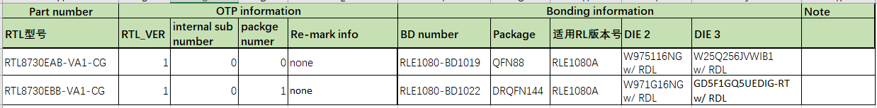 Package number需要结合RTL_NO+RTL_VER使用,每一个RTL_NO+RTL_VER的组合对应一组从0开始计数的Package number流水号。如RTL8730E-VA1 中Package number = 0对应的线图和RTL8730E-VA2 中Package number = 0的线图可能是不一样的。