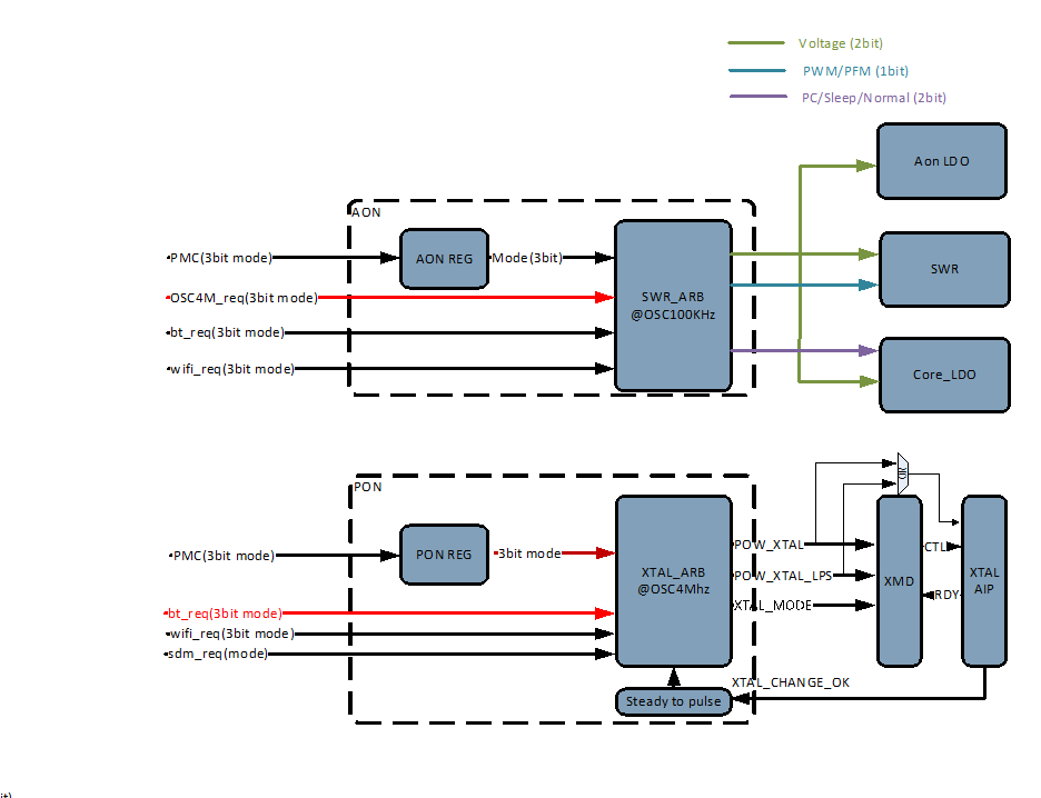 The figure shown below is timing of power sequence of soc_arb_pmc. If both wifi and hsoc de-assert their requests, the pmc will start to trun off power cut of PD_SOC and react to new requests until the state machine is idle.