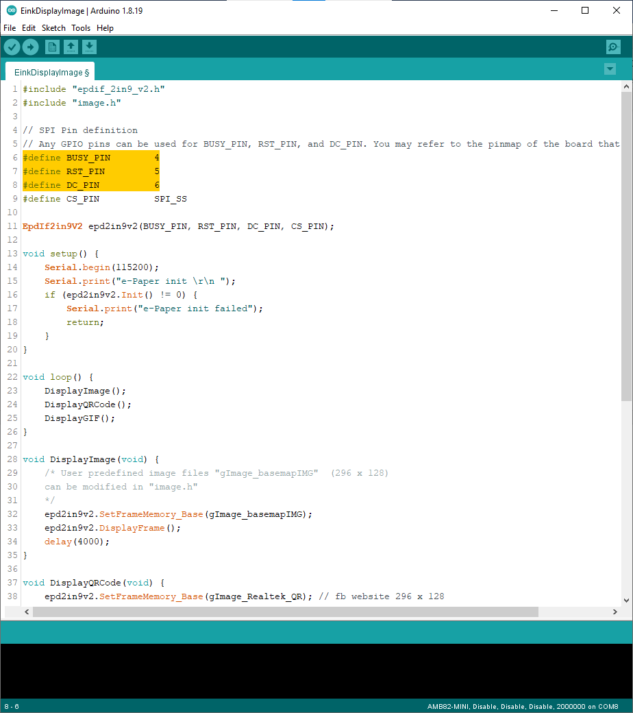 You may choose any GPIO pins for Busy, Reset and DC pin. You can refer to for AMB82-Mini’s pinmap.