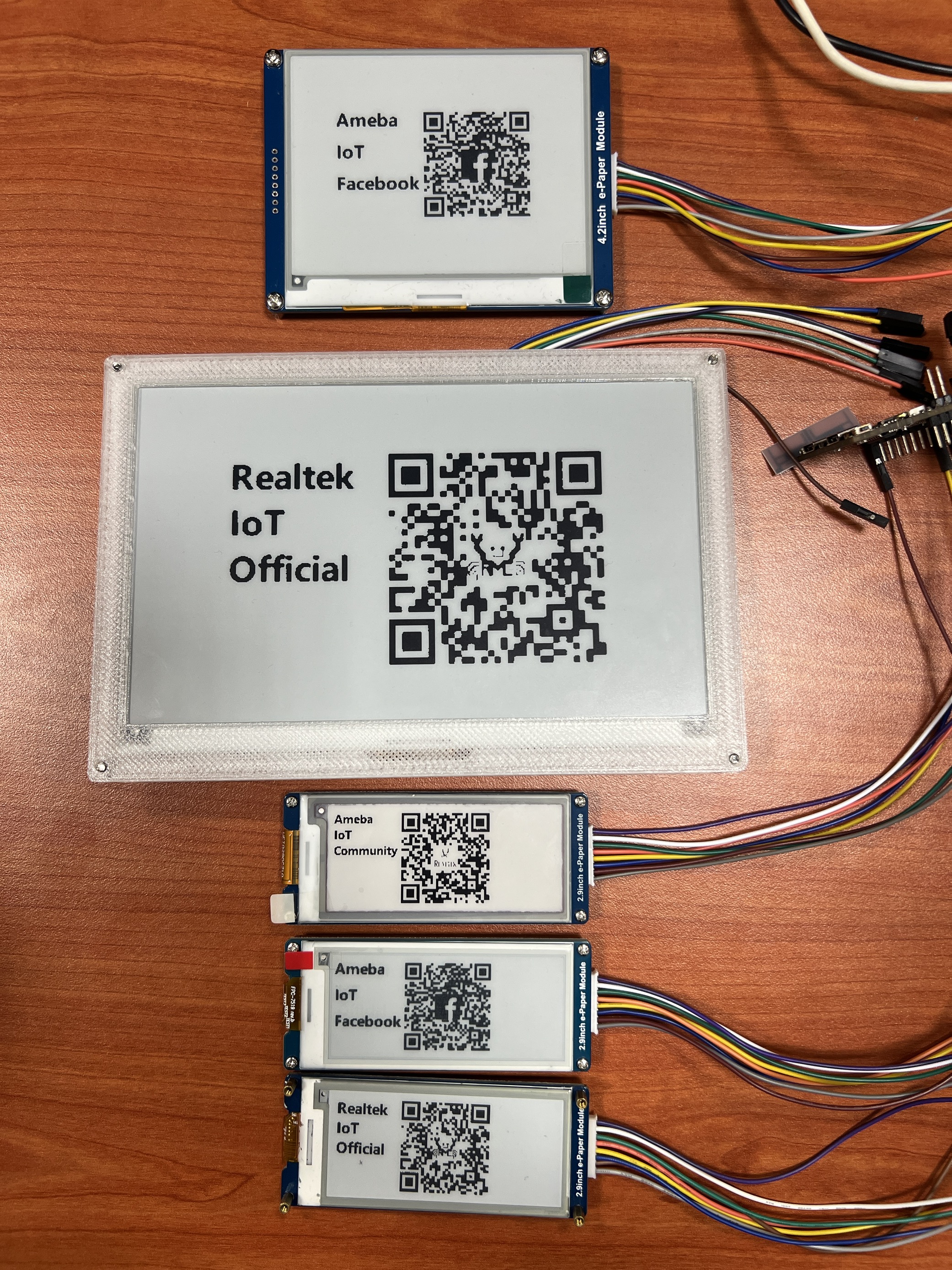 The 2.9-inch e-Paper Module (B) supports three colours—red, black, and white. You may refer to the example for 2.9-inch e-Paper Module (B) to learn how to display red images by navigating to “File” -> “Examples” -> “AmebaEink” -> “EPD_2in9b”-> “EinkDisplayImages”.