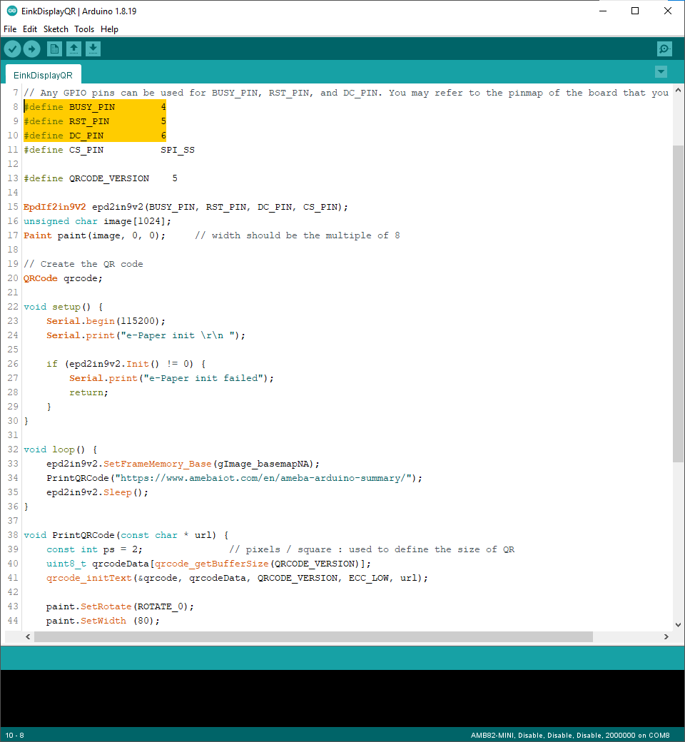 Open one of the “EinkDisplayQR” examples. For example, “File” -> “Examples” -> “AmebaEink” -> “EPD_2in9v2”-> “EinkDisplayQR”: