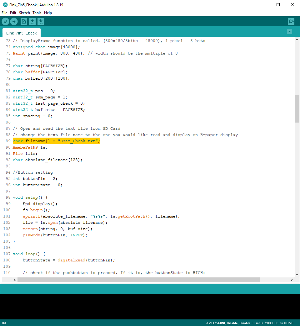 After AmebaEink.zip is installed, Open the “Eink_7in5_Ebook” example by selecting “File” -> “Examples” -> “AmebaEink” -> “EPD_7in5” -> “Eink_7in5_Ebook”.