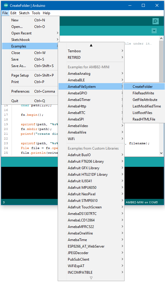 Open the example, “Files” -> “Examples” -> “AmebaFileSystem” -> “CreateFolder”.