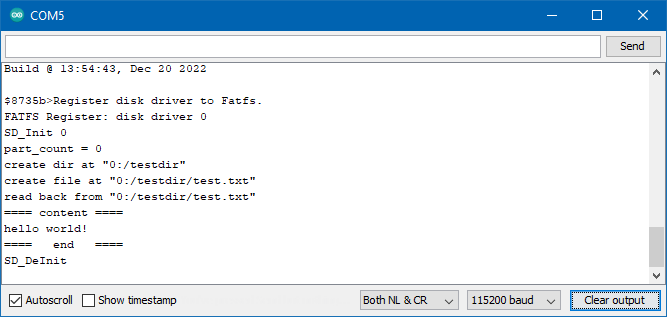 The sample code first creates a folder named “testdir”, a text file named “test.txt” is next created, and the text “hello world!” is saved into the file. After that, the contents of the file are retrieved and printed to the serial monitor.