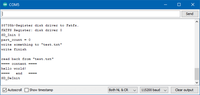The sample code first creates a text file named “test.txt”, then the text “hello world!” is saved into the file. After that, the contents of the file are retrieved and printed to the serial monitor.