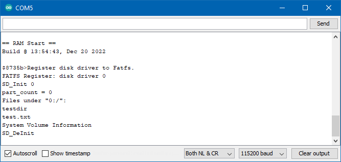Open the example, “Files” -> “Examples” -> “AmebaFileSystem” -> “ListRootFiles”.