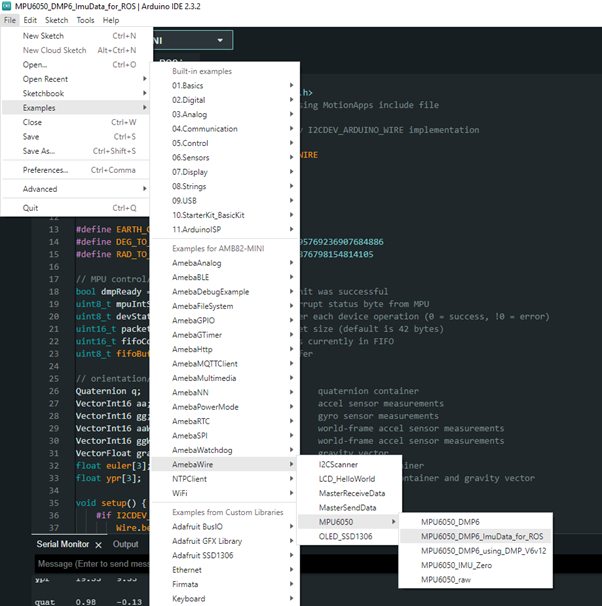 Open the example in “File” -> “Examples” -> “AmebaWire” -> “MPU6050”-> “MPU6050_DMP6_ImuData_for_ROS.ino”.