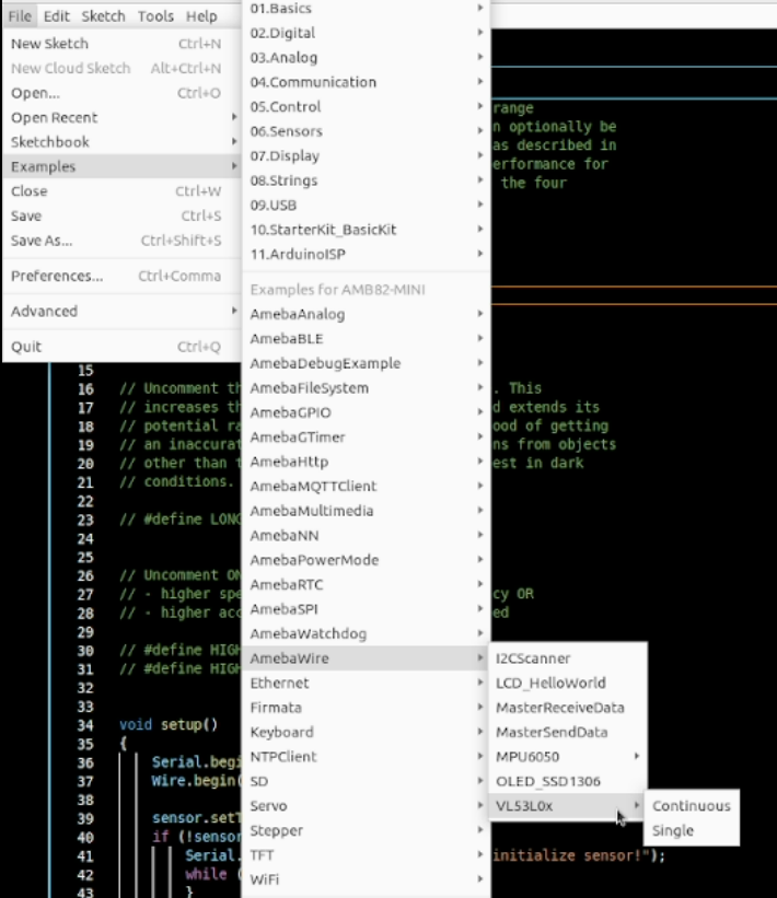 Open the example in “File” -> “Examples” -> “AmebaWire” -> “VL53L0X” -> “Continuous” or “Single”.