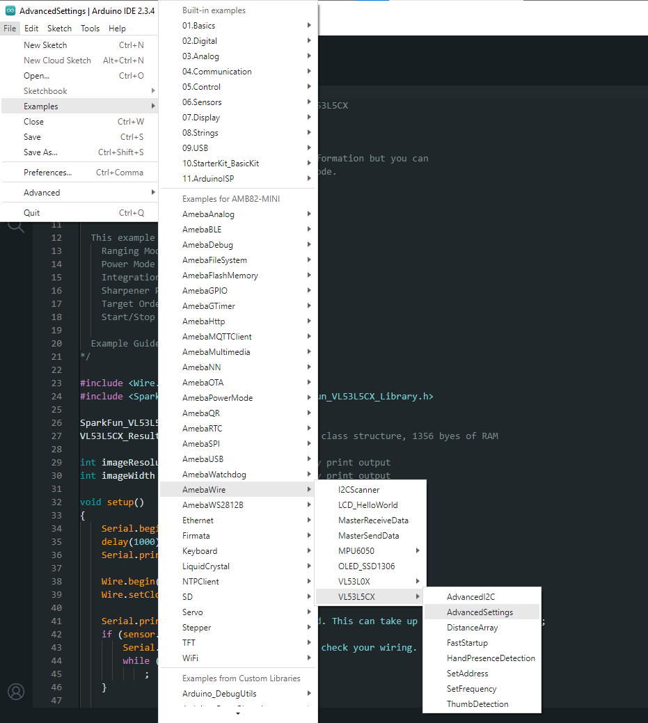 Open the example in “File” -> “Examples” -> “AmebaWire” -> “VL53L5CX” -> “AdvancedSettings”.