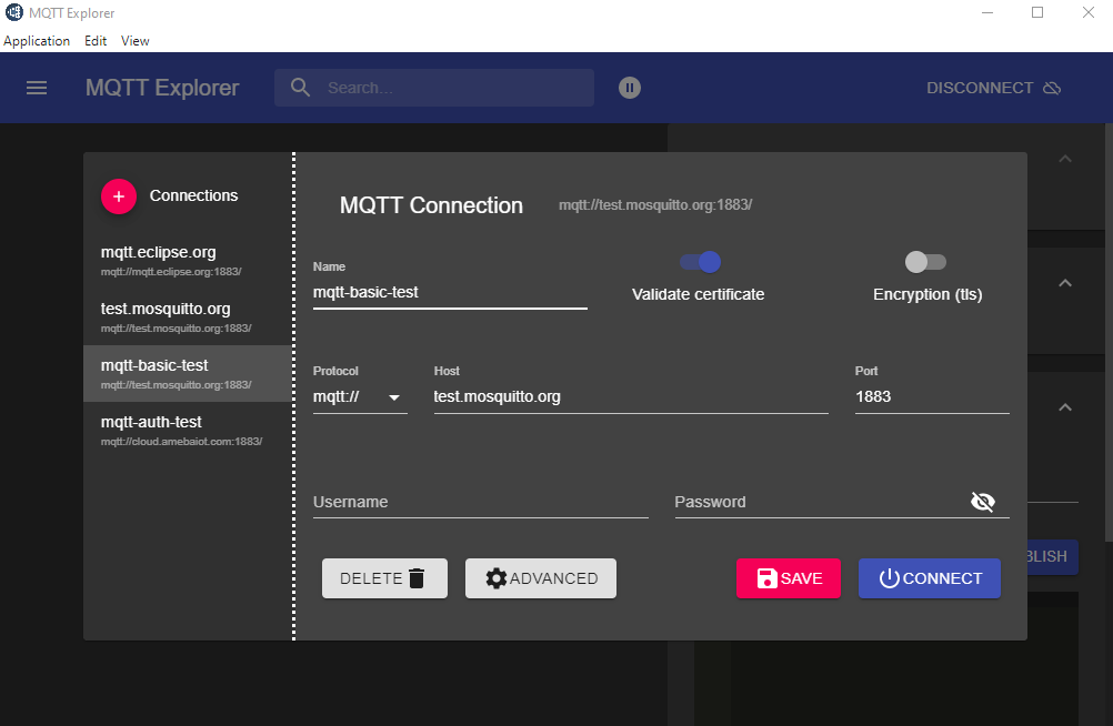 Click “Connections” at top left to start a new connection setup. “Name” can be customized. Set “Host” as “test.mosquitto.org”.