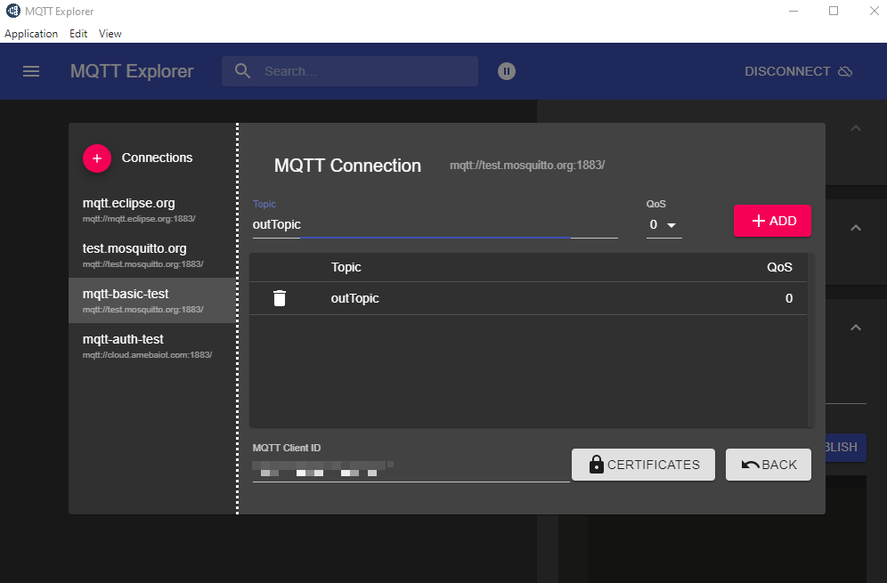 After Ameba is connected to MQTT server, it sends the message “hello world” to “outTopic”. To see the message, another MQTT client needs to be set up.