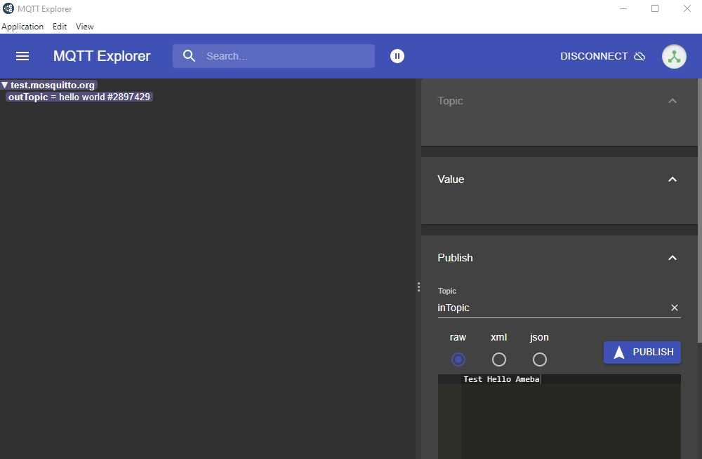 Click “CONNECT”. The “hello world” message show up at left side. At right side, under “Publish” use “inTopic” same as “subscribeTopic” of the board. Choose “raw” and input “Text hello Ameba”, then click “PUBLISH”. The board will receive the MQTT Explorer published raw message. Note, because of the host is a free public host, the board may receive unexpected messages.