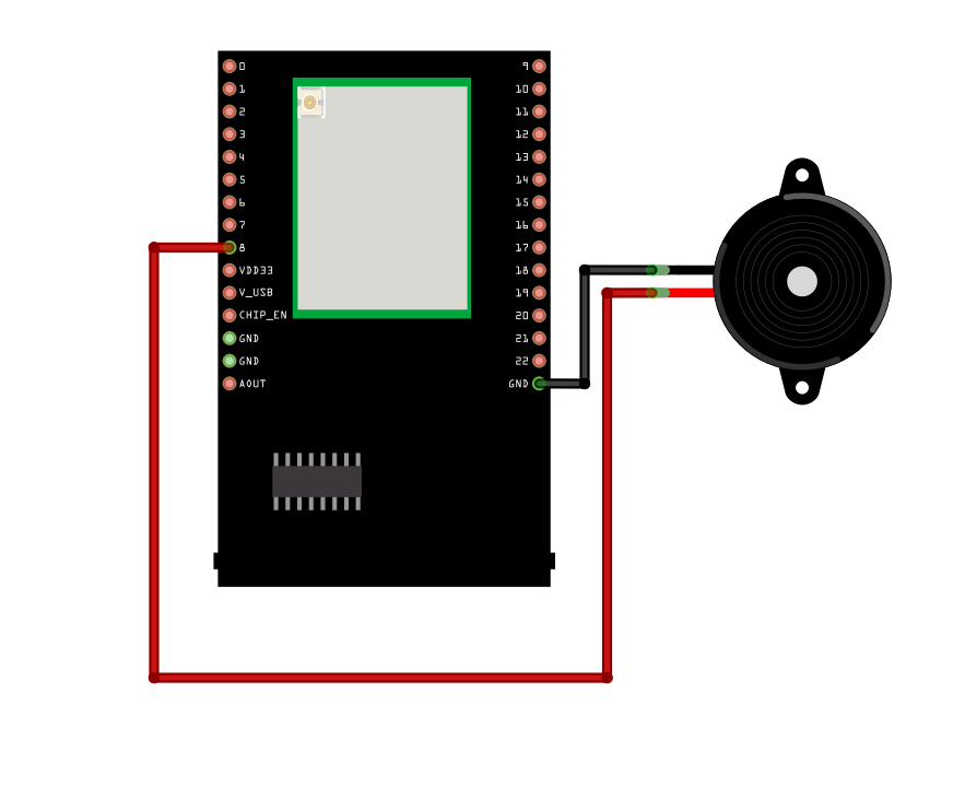 Connect the buzzer to the PWM output pin shown in the following diagrams.