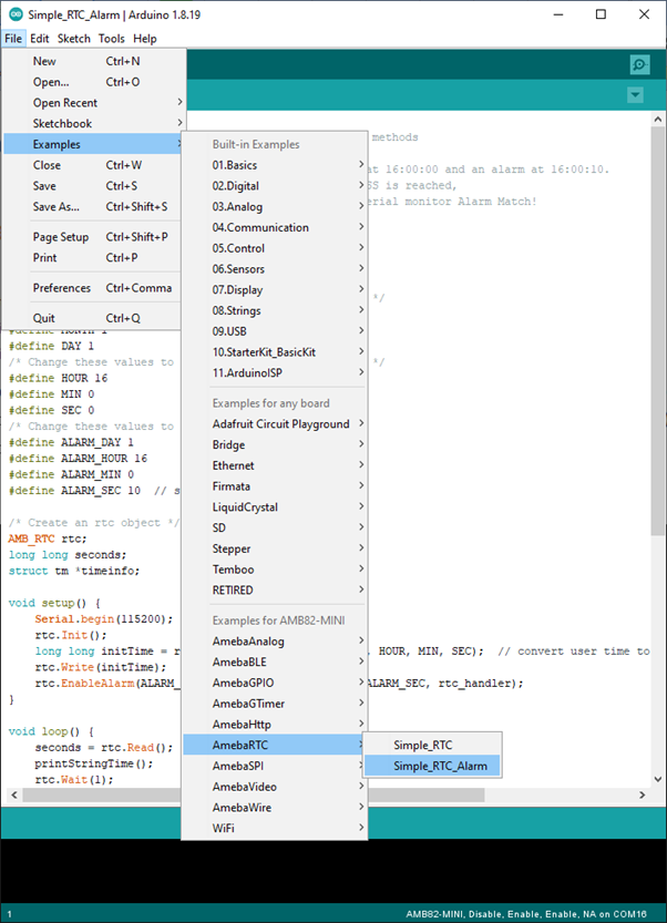 Then open the “ RTCAlarm “ example from: “File” -> “Examples” -> “RTC” -> “Simple_RTC_Alarm”: