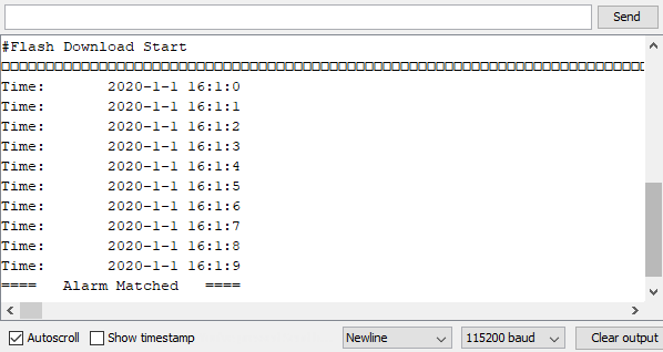In the example, the RTC time is set at 16:00:00 and an alarm is set at 16:00:10. Upon successfully upload the sample code and press the reset button. When the alarm time (10 seconds) is reached the attached interrupt function will print the following information: “Alarm Matched!” showing in this figure below.