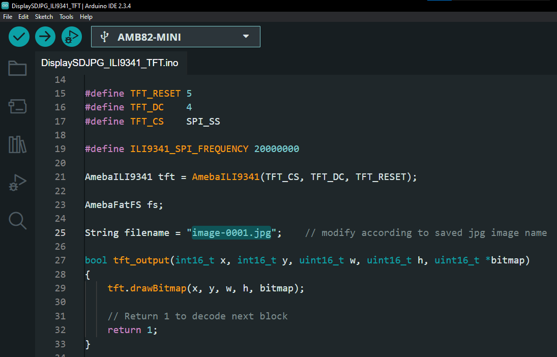 Open the example, “File” -> “Examples” -> “AmebaSPI” -> “DisplaySDJPG_ILI9341_TFT”