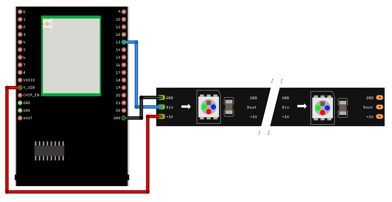 Connect the WS2812B to the Ameba board as shown in the following diagrams.