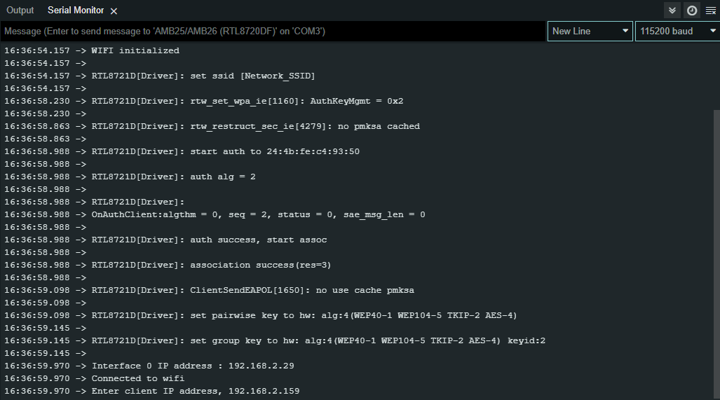 Modify the ssid, password and key index (optional). Compile and upload the code from the Arduino IDE to Ameba and press the reset button when the upload is complete. Ameba should connect to the same network as the computer.