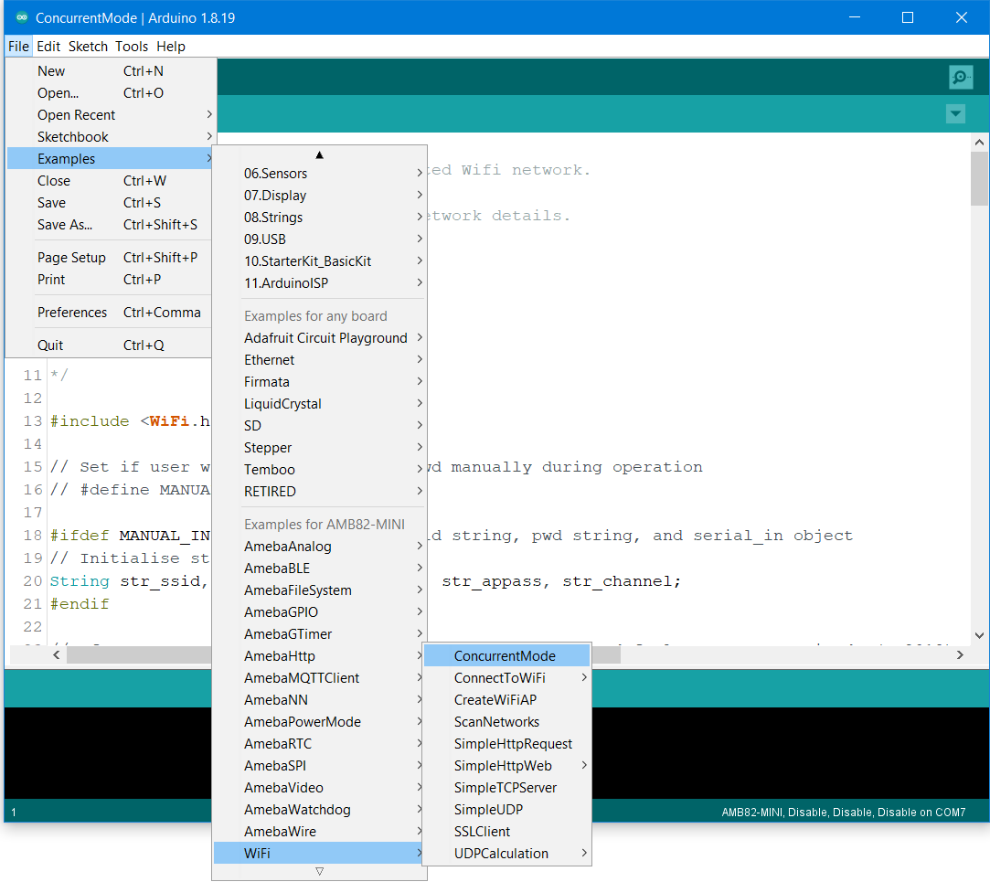 First, open the example in “File” -> “Examples” -> “WiFi” -> “ConcurrentMode”.