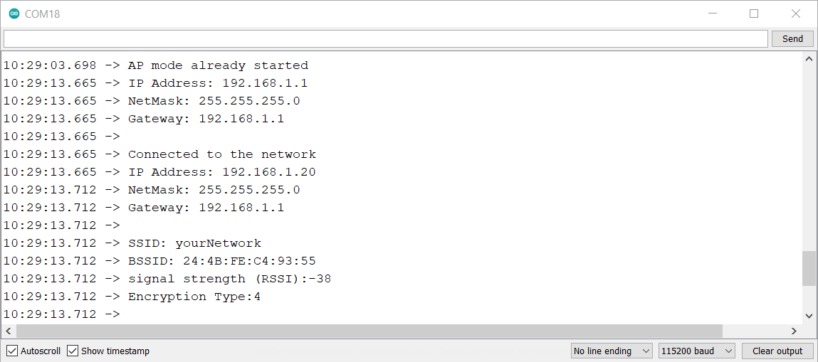 Next, you will see the information of the AP mode shown, and after that you will see a message “Connected to the network”, and the information of this WiFi connection is printed in the serial monitor every 10 seconds.