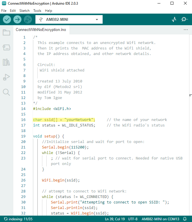 Open example in “File” -> “Examples” -> “WiFi” -> “ConnectToWiFi” -> “NoEncryption”