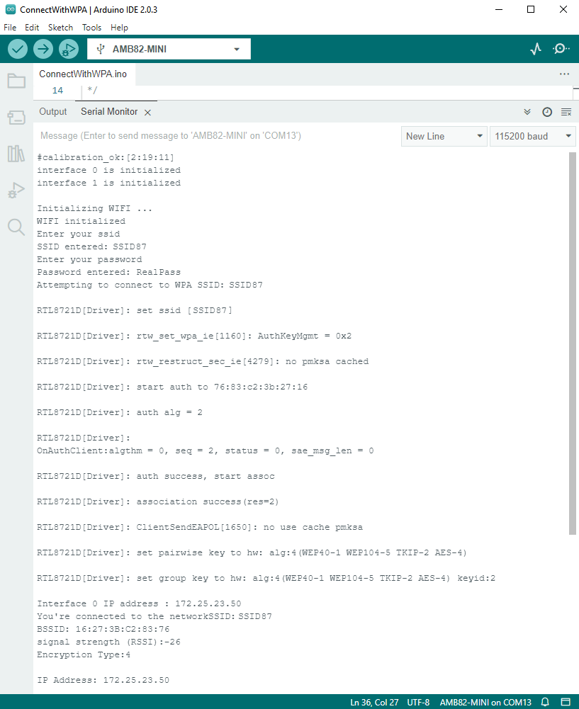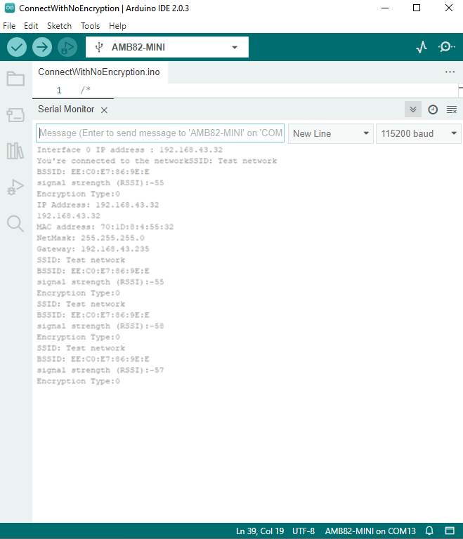 Note: If you enabled MANUAL_INPUT, after uploading the sample code and pressing the reset button on Ameba, input your SSID in the Serial monitor and press enter. Next, input your key and press enter. Finally enter your password and press enter. Then you will see a message “You’re connected to the networkSSID: XXXXX”, and the information of this WiFi connection is printed in the serial monitor every 10 seconds.
