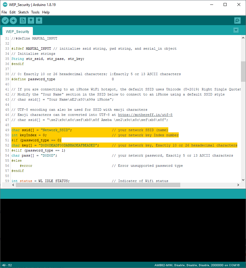 In the sample code, modify “ssid” to the SSID to be connected, “key” to the hexadecimal password, “keyIndex” to your key index number.