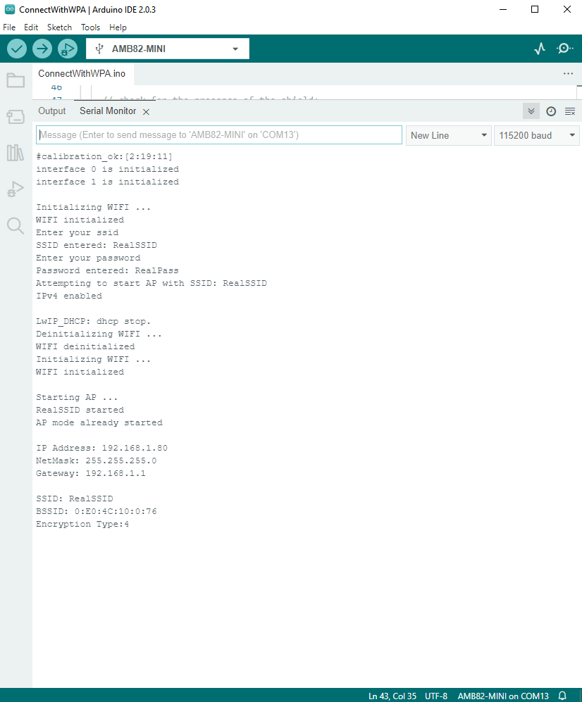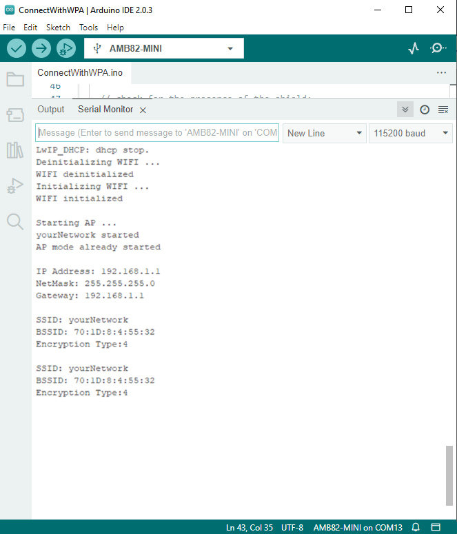 Note: If you enabled MANUAL_INPUT, after uploading the sample code and pressing the reset button on Ameba, input your SSID in the Serial monitor and press enter. Next, input your password and press enter. AP mode should start after that.
