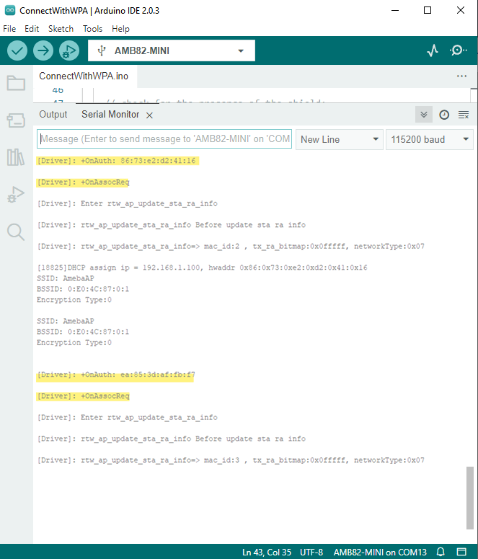 In the figure below, we show the messages shown in serial monitor when two stations connect to Ameba AP in open mode: